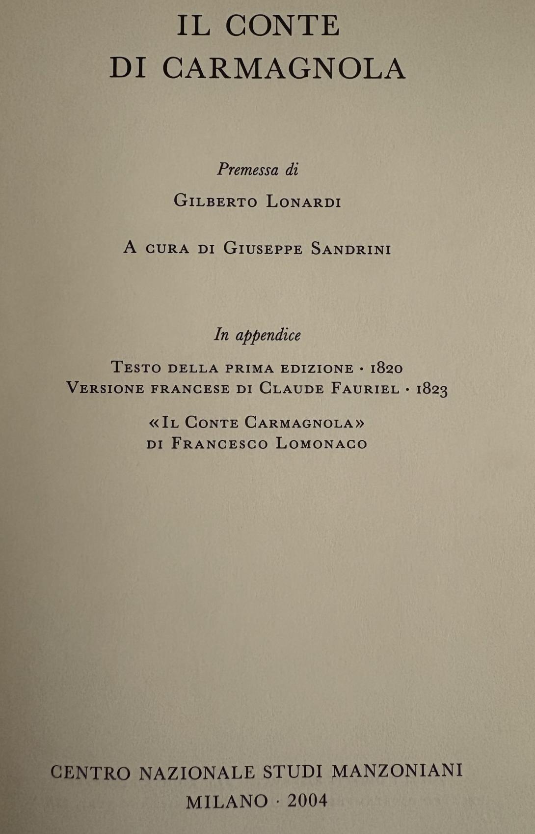 In appendice Testo della prima edizione (1820); versione francese di Claude Fauriel (1823); Il Conte Carmagnola di Francesco Lomonaco